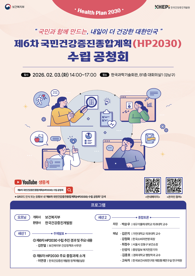 [Çà»ç°³¿ä] Çà»ç¸í : Á¦6Â÷ ±¹¹Î°Ç°ÁõÁøÁ¾ÇÕ°èȹ(HP2030) ¼ö¸³ °øÃ»È¸ <±¹¹Î°ú ÇÔ²² ¸¸µå´Â, ³»ÀÏÀÌ ´õ °Ç°ÇÑ ´ëÇѹα¹> Çà»çÀϽà : 2026. 02. 03. (È) 14:00 - 17:00 Çà»çÀå¼Ò : Çѱ¹°úÇбâ¼úȸ°ü, B1Ãþ ´ëȸÀǽÇ1(¼¿ï °³²±¸ Å×Çì¶õ·Î7±æ 22) ÇÁ·Î±×·¥ : °³È¸»ç, ȯ¿µ»ç, ÁÖÁ¦¹ßÇ¥, Á¾ÇÕÅä·Ð µî Âü¼®¹æ¹ý : ¿Â¶óÀÎ Âü¼®